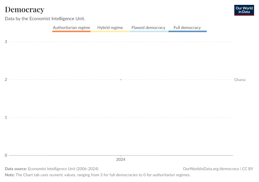 “Data Page: Democracy”, part of the following publication: Bastian Herre, Lucas Rodés-Guirao, and Esteban Ortiz-Ospina (2013) - “Democracy”. Data adapted from Economist Intelligence Unit, Gapminder. Retrieved from https://archive.ourworldindata.org/20250909-093708/grapher/political-regime-eiu.html [online resource] (archived on September 9, 2025).
