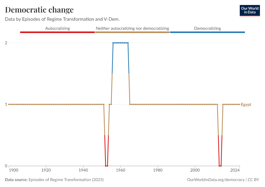 Episodes of Regime Transformation (2025) – processed by Our World in Data. “Democratic change” [dataset]. V-Dem, “Episodes of Regime Transformation v15” [original data]. Retrieved January 11, 2026 from https://archive.ourworldindata.org/20250909-093708/grapher/political-regime-ert.html (archived on September 9, 2025).