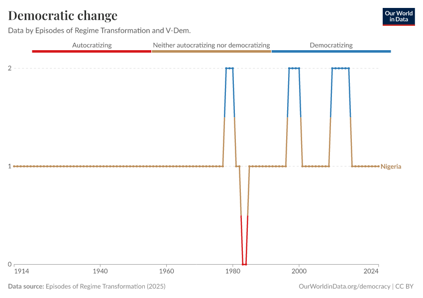 “Data Page: Democratic change”, part of the following publication: Bastian Herre, Lucas Rodés-Guirao, and Esteban Ortiz-Ospina (2013) - “Democracy”. Data adapted from V-Dem. Retrieved from https://archive.ourworldindata.org/20250909-093708/grapher/political-regime-ert.html [online resource] (archived on September 9, 2025).How to cite this data