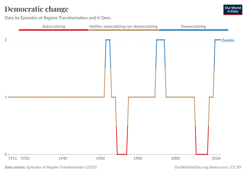 Episodes of Regime Transformation (2025) – processed by Our World in Data. “Democratic change” [dataset]. V-Dem, “Episodes of Regime Transformation v15” [original data]. Retrieved January 9, 2026 from https://archive.ourworldindata.org/20250909-093708/grapher/political-regime-ert.html (archived on September 9, 2025).