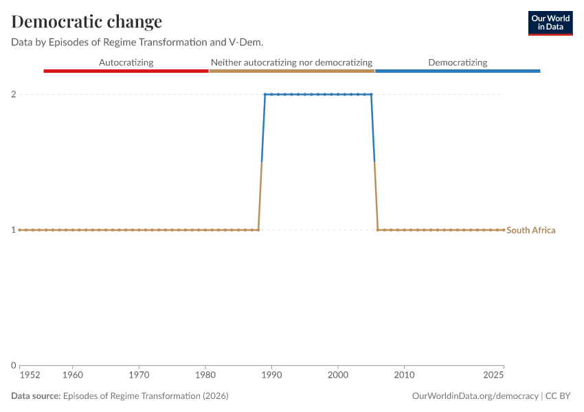 Episodes of Regime Transformation (2026) – processed by Our World in Data. “Democratic change” [dataset]. V-Dem, “Episodes of Regime Transformation v16” [original data]. Retrieved April 20, 2026 from https://archive.ourworldindata.org/20260417-112857/grapher/political-regime-ert.html (archived on April 17, 2026).Download