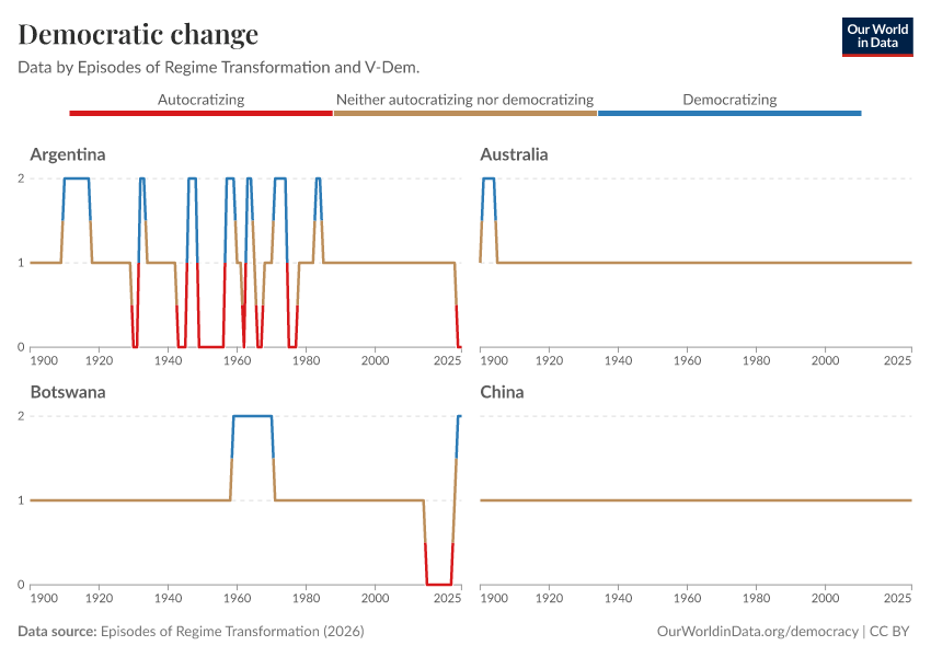 Episodes of Regime Transformation (2026) – processed by Our World in Data. “Democratic change” [dataset]. V-Dem, “Episodes of Regime Transformation v16” [original data]. Retrieved April 25, 2026 from https://archive.ourworldindata.org/20260417-112857/grapher/political-regime-ert.html (archived on April 17, 2026).Download