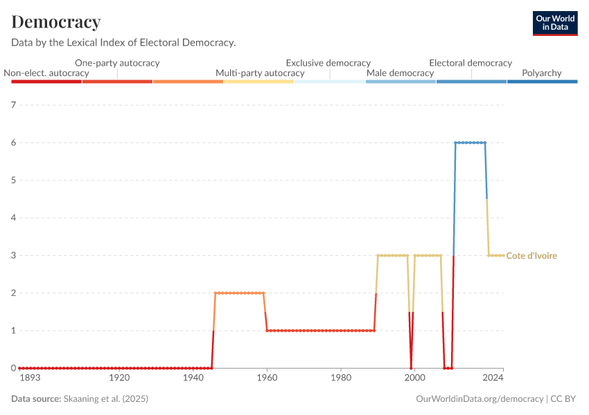 “Data Page: Democracy”, part of the following publication: Bastian Herre, Lucas Rodés-Guirao, and Esteban Ortiz-Ospina (2013) - “Democracy”. Data adapted from Skaaning et al.. Retrieved from https://archive.ourworldindata.org/20250909-093708/grapher/political-regime-lexical.html [online resource] (archived on September 9, 2025).