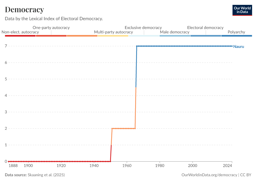 Skaaning et al. (2025) – processed by Our World in Data. “Democracy” [dataset]. Skaaning et al., “Lexical Index of Electoral Democracy (LIED) v6.8” [original data]. Retrieved January 11, 2026 from https://archive.ourworldindata.org/20250909-093708/grapher/political-regime-lexical.html (archived on September 9, 2025).