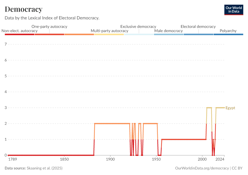 Skaaning et al. (2025) – processed by Our World in Data. “Democracy” [dataset]. Skaaning et al., “Lexical Index of Electoral Democracy (LIED) v6.8” [original data]. Retrieved November 11, 2025 from https://archive.ourworldindata.org/20250909-093708/grapher/political-regime-lexical.html (archived on September 9, 2025).