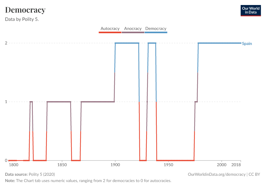 - We have other democracy data sources that also cover more recent years and have more precise data. You can find them in our Key Democracy Charts and Democracy Data Explorer.