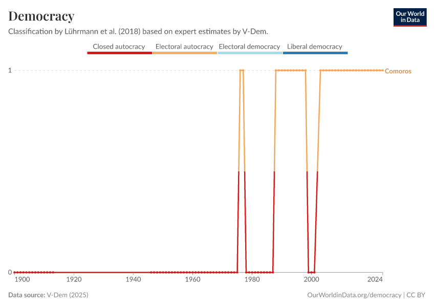“Data Page: Democracy”, part of the following publication: Bastian Herre, Lucas Rodés-Guirao, and Esteban Ortiz-Ospina (2013) - “Democracy”. Data adapted from V-Dem. Retrieved from https://archive.ourworldindata.org/20250909-093708/grapher/political-regime.html [online resource] (archived on September 9, 2025).