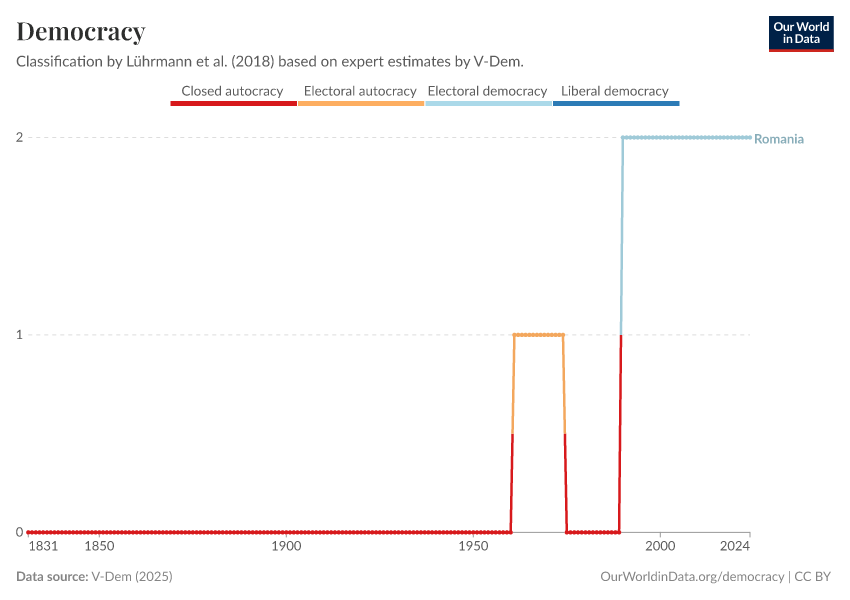 “Data Page: Democracy”, part of the following publication: Bastian Herre, Lucas Rodés-Guirao, and Esteban Ortiz-Ospina (2013) - “Democracy”. Data adapted from V-Dem. Retrieved from https://archive.ourworldindata.org/20250909-093708/grapher/political-regime.html [online resource] (archived on September 9, 2025).How to cite this data