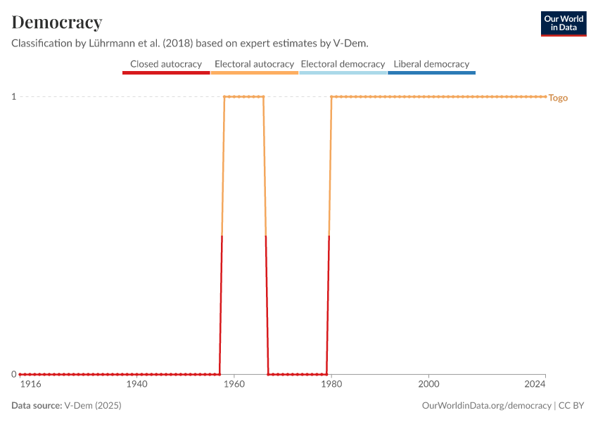 “Data Page: Democracy”, part of the following publication: Bastian Herre, Lucas Rodés-Guirao, and Esteban Ortiz-Ospina (2013) - “Democracy”. Data adapted from V-Dem. Retrieved from https://archive.ourworldindata.org/20260119-070102/grapher/political-regime.html [online resource] (archived on January 19, 2026).How to cite this data