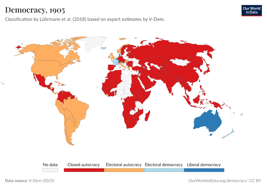 “Data Page: Democracy”, part of the following publication: Bastian Herre, Lucas Rodés-Guirao, and Esteban Ortiz-Ospina (2013) - “Democracy”. Data adapted from V-Dem. Retrieved from https://archive.ourworldindata.org/20250909-093708/grapher/political-regime.html [online resource] (archived on September 9, 2025).