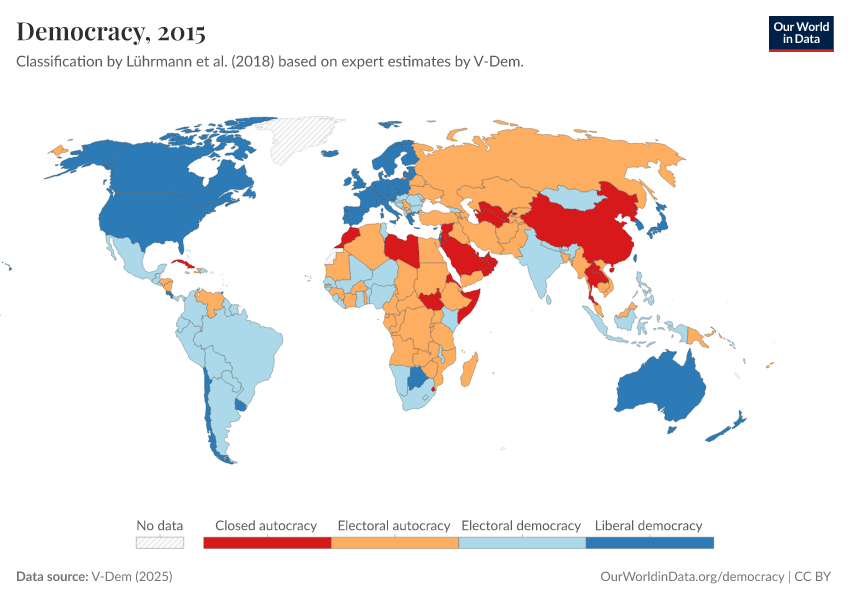 V-Dem (2025) – processed by Our World in Data. “Democracy” [dataset]. V-Dem, “Democracy report v15” [original data]. Retrieved January 16, 2026 from https://archive.ourworldindata.org/20250909-093708/grapher/political-regime.html (archived on September 9, 2025).