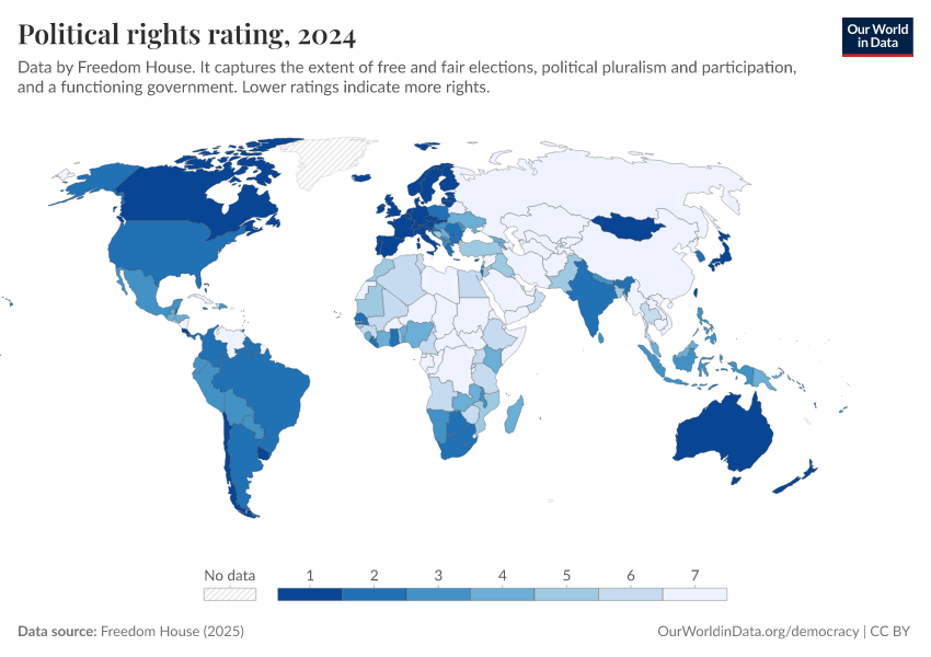 Freedom House (2025) – processed by Our World in Data. “Political rights rating” [dataset]. Freedom House, “Freedom in the World” [original data]. Retrieved January 14, 2026 from https://archive.ourworldindata.org/20250909-093708/grapher/political-rights-rating-fh.html (archived on September 9, 2025).