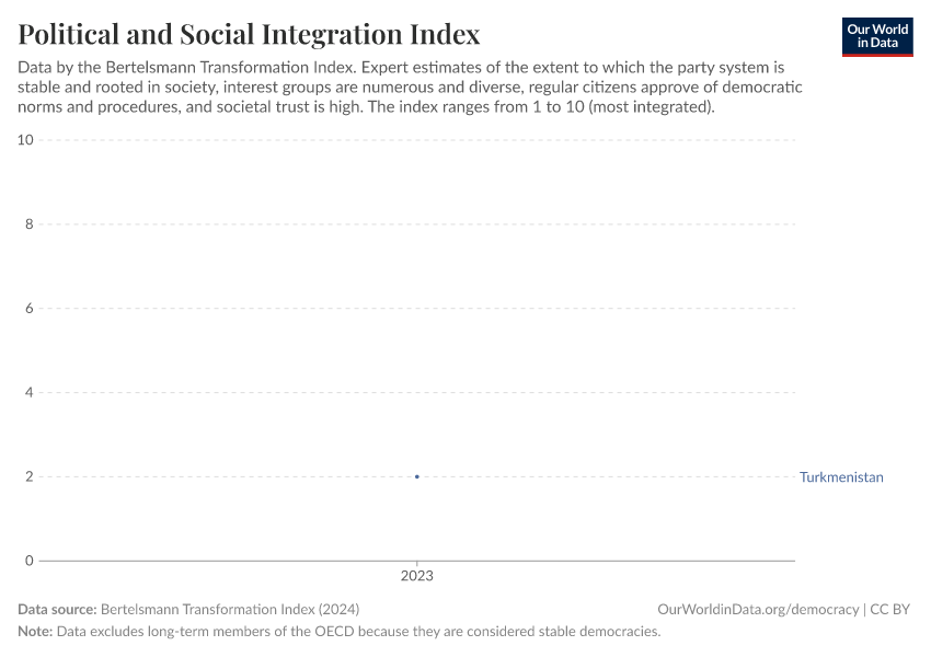 “Data Page: Political and Social Integration Index”, part of the following publication: Bastian Herre, Lucas Rodés-Guirao, and Esteban Ortiz-Ospina (2013) - “Democracy”. Data adapted from Bertelsmann Transformation Index. Retrieved from https://archive.ourworldindata.org/20251209-133038/grapher/political-social-integration-index-bti.html [online resource] (archived on December 9, 2025).How to cite this data