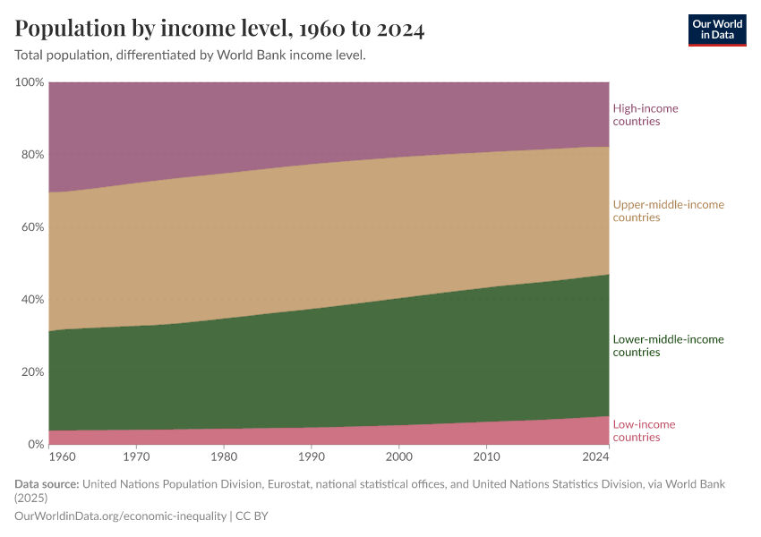 United Nations Population Division, Eurostat, national statistical offices, and United Nations Statistics Division, via World Bank (2025) – processed by Our World in Data. “Population by income level” [dataset]. United Nations Population Division, Eurostat, national statistical offices, and United Nations Statistics Division, via World Bank, “World Development Indicators 122” [original data]. Retrieved December 8, 2025 from https://archive.ourworldindata.org/20250916-102301/grapher/population-by-income-level.html (archived on September 16, 2025).