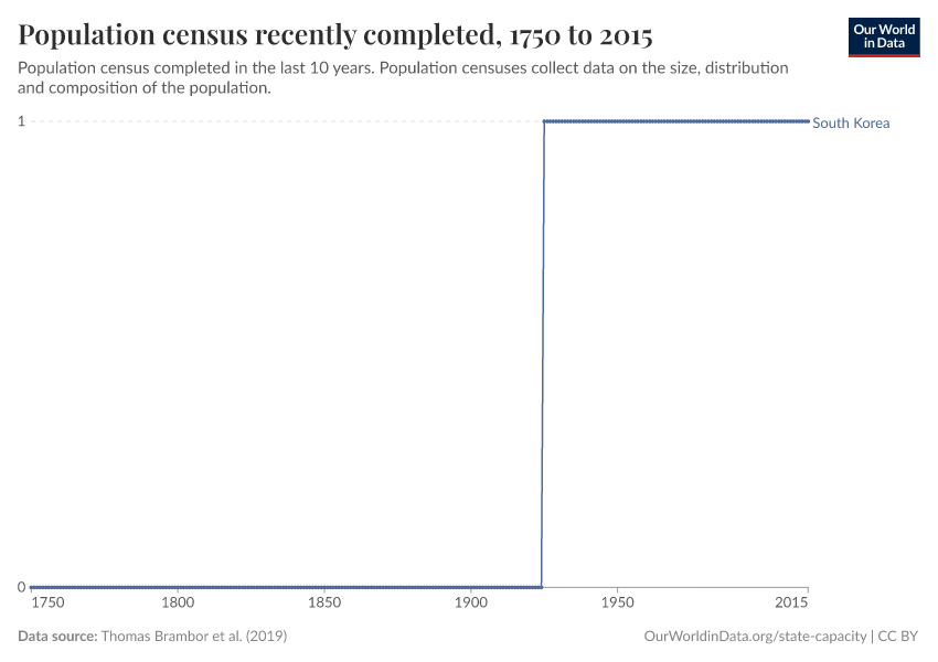 Thomas Brambor et al. (2019) – with major processing by Our World in Data. “Population census recently completed” [dataset]. Thomas Brambor et al., “Information Capacity Dataset” [original data]. Retrieved December 5, 2025 from https://archive.ourworldindata.org/20250909-093708/grapher/population-census-brambor.html (archived on September 9, 2025).