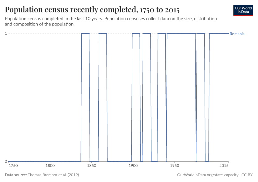 Thomas Brambor et al. (2019) – with major processing by Our World in Data. “Population census recently completed” [dataset]. Thomas Brambor et al., “Information Capacity Dataset” [original data]. Retrieved December 5, 2025 from https://archive.ourworldindata.org/20250909-093708/grapher/population-census-brambor.html (archived on September 9, 2025).