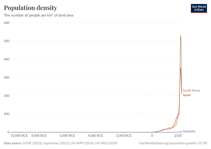 “Data Page: Population density”, part of the following publication: Hannah Ritchie, Lucas Rodés-Guirao, Edouard Mathieu, Marcel Gerber, Esteban Ortiz-Ospina, Joe Hasell, and Max Roser (2023) - “Population Growth”. Data adapted from PBL Netherlands Environmental Assessment Agency, Gapminder, United Nations, Food and Agriculture Organization of the United Nations. Retrieved from https://archive.ourworldindata.org/20250929-103213/grapher/population-density.html [online resource] (archived on September 29, 2025).How to cite this data