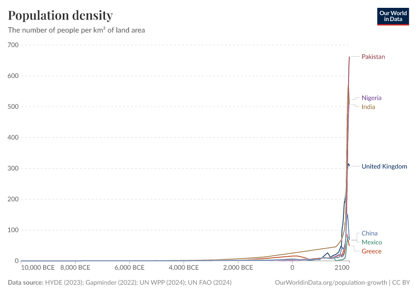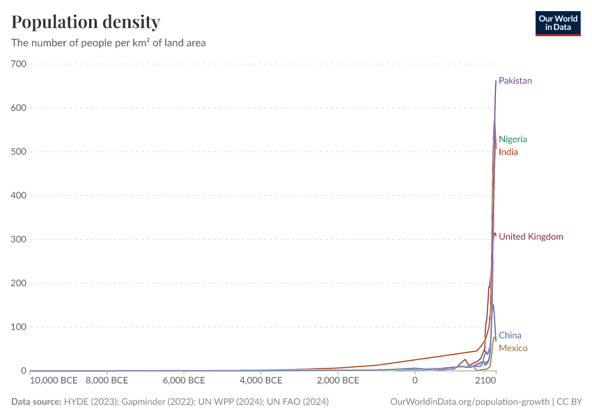 “Data Page: Population density”, part of the following publication: Hannah Ritchie, Lucas Rodés-Guirao, Edouard Mathieu, Marcel Gerber, Esteban Ortiz-Ospina, Joe Hasell, and Max Roser (2023) - “Population Growth”. Data adapted from PBL Netherlands Environmental Assessment Agency, Gapminder, United Nations, Food and Agriculture Organization of the United Nations. Retrieved from https://archive.ourworldindata.org/20250929-103213/grapher/population-density.html [online resource] (archived on September 29, 2025).How to cite this data