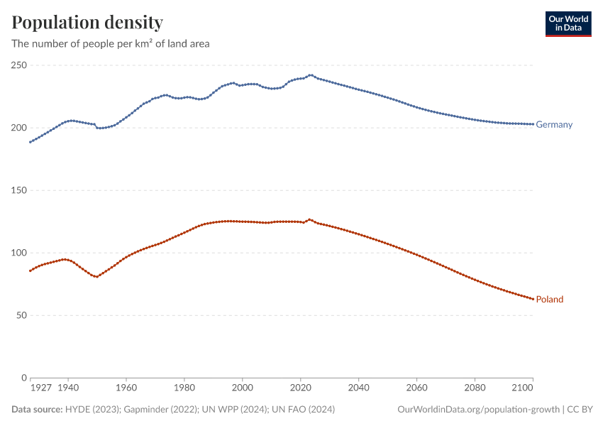 “Data Page: Population density”, part of the following publication: Hannah Ritchie, Lucas Rodés-Guirao, Edouard Mathieu, Marcel Gerber, Esteban Ortiz-Ospina, Joe Hasell, and Max Roser (2023) - “Population Growth”. Data adapted from PBL Netherlands Environmental Assessment Agency, Gapminder, United Nations, Food and Agriculture Organization of the United Nations. Retrieved from https://archive.ourworldindata.org/20250929-103213/grapher/population-density.html [online resource] (archived on September 29, 2025).How to cite this data