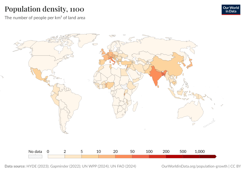 “Data Page: Population density”, part of the following publication: Hannah Ritchie, Lucas Rodés-Guirao, Edouard Mathieu, Marcel Gerber, Esteban Ortiz-Ospina, Joe Hasell, and Max Roser (2023) - “Population Growth”. Data adapted from PBL Netherlands Environmental Assessment Agency, Gapminder, United Nations, Food and Agriculture Organization of the United Nations. Retrieved from https://archive.ourworldindata.org/20250929-103213/grapher/population-density.html [online resource] (archived on September 29, 2025).How to cite this data