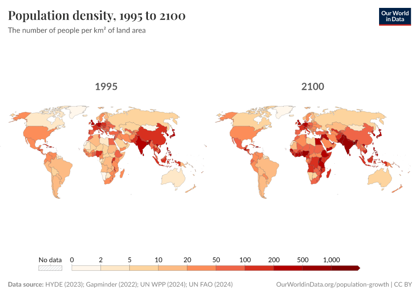 “Data Page: Population density”, part of the following publication: Hannah Ritchie, Lucas Rodés-Guirao, Edouard Mathieu, Marcel Gerber, Esteban Ortiz-Ospina, Joe Hasell, and Max Roser (2023) - “Population Growth”. Data adapted from PBL Netherlands Environmental Assessment Agency, Gapminder, United Nations, Food and Agriculture Organization of the United Nations. Retrieved from https://archive.ourworldindata.org/20250929-103213/grapher/population-density.html [online resource] (archived on September 29, 2025).How to cite this data