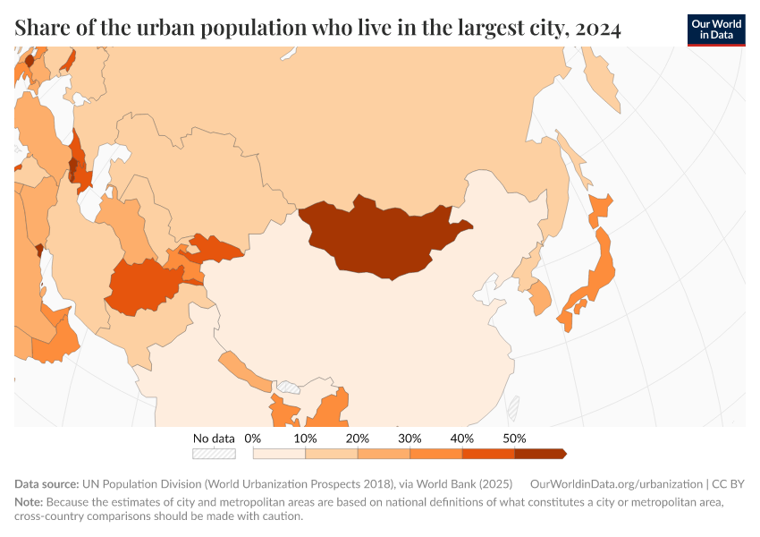 “Data Page: Share of the urban population who live in the largest city”. Our World in Data (2025). Data adapted from UN Population Division (World Urbanization Prospects 2018), via World Bank. Retrieved from https://archive.ourworldindata.org/20250916-102301/grapher/population-in-the-largest-city.html [online resource] (archived on September 16, 2025).How to cite this data