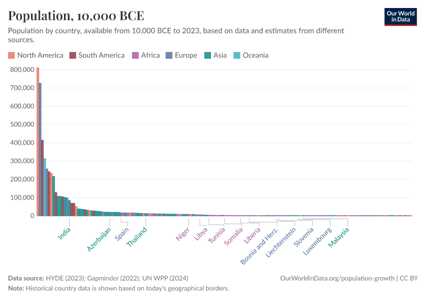 “Data Page: Population”, part of the following publication: Hannah Ritchie, Lucas Rodés-Guirao, Edouard Mathieu, Marcel Gerber, Esteban Ortiz-Ospina, Joe Hasell, and Max Roser (2023) - “Population Growth”. Data adapted from PBL Netherlands Environmental Assessment Agency, Gapminder, United Nations. Retrieved from https://archive.ourworldindata.org/20251209-133038/grapher/population-marimekko.html [online resource] (archived on December 9, 2025).How to cite this data