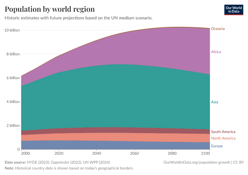 “Data Page: Population by world region”, part of the following publication: Hannah Ritchie, Lucas Rodés-Guirao, Edouard Mathieu, Marcel Gerber, Esteban Ortiz-Ospina, Joe Hasell, and Max Roser (2023) - “Population Growth”. Data adapted from PBL Netherlands Environmental Assessment Agency, Gapminder, United Nations. Retrieved from https://archive.ourworldindata.org/20250929-103213/grapher/population-regions-with-projections.html [online resource] (archived on September 29, 2025).How to cite this data