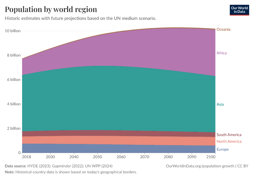 HYDE (2023); Gapminder (2022); UN WPP (2024) – with major processing by Our World in Data. “Population by world region” [dataset]. PBL Netherlands Environmental Assessment Agency, “History Database of the Global Environment 3.3”; Gapminder, “Population v7”; United Nations, “World Population Prospects”; United Nations, “World Population Prospects - Interim Update”; Gapminder, “Systema Globalis” [original data]. Retrieved April 5, 2026 from https://archive.ourworldindata.org/20260402-163007/grapher/population-regions-with-projections.html (archived on April 2, 2026).Download