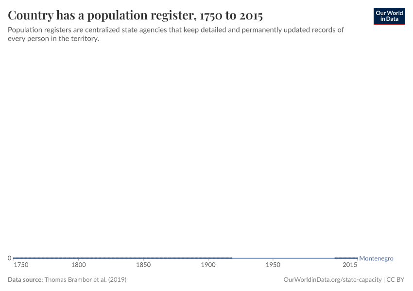 Thomas Brambor et al. (2019) – with minor processing by Our World in Data. “Country has a population register” [dataset]. Thomas Brambor et al., “Information Capacity Dataset” [original data]. Retrieved December 25, 2025 from https://archive.ourworldindata.org/20250909-093708/grapher/population-register-implemented.html (archived on September 9, 2025).