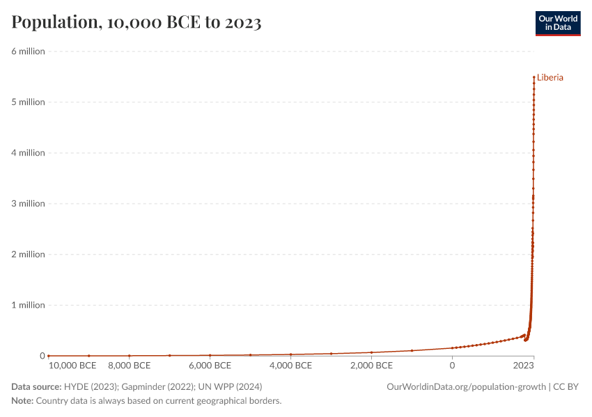 HYDE (2023); Gapminder (2022); UN WPP (2024) – with major processing by Our World in Data. “Population – HYDE, Gapminder, UN – Long-run data” [dataset]. PBL Netherlands Environmental Assessment Agency, “History Database of the Global Environment 3.3”; Gapminder, “Population v7”; United Nations, “World Population Prospects”; United Nations, “World Population Prospects - Interim Update”; Gapminder, “Systema Globalis” [original data]. Retrieved April 18, 2026 from https://archive.ourworldindata.org/20260417-111409/grapher/population.html (archived on April 17, 2026).Download