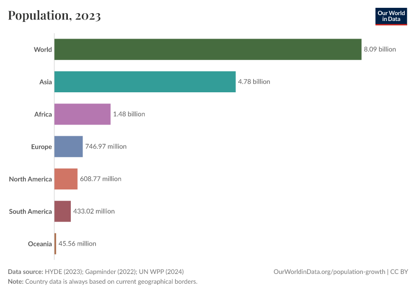 - We calculate geographical aggregates (continents, income groups, etc.) by summing individual country populations. For years before 1800, we rely directly on HYDE's values for continents to ensure historical consistency.