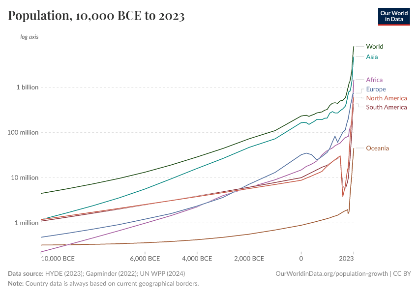 “Data Page: Population”, part of the following publication: Hannah Ritchie, Lucas Rodés-Guirao, Edouard Mathieu, Marcel Gerber, Esteban Ortiz-Ospina, Joe Hasell, and Max Roser (2023) - “Population Growth”. Data adapted from PBL Netherlands Environmental Assessment Agency, Gapminder, United Nations. Retrieved from https://archive.ourworldindata.org/20250929-103213/grapher/population.html [online resource] (archived on September 29, 2025).