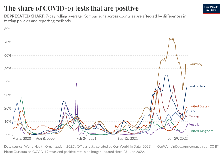 “Data Page: The share of COVID-19 tests that are positive”. Our World in Data (2025). Data adapted from World Health Organization, Official data collated by Our World in Data. Retrieved from https://archive.ourworldindata.org/20251219-063428/grapher/positive-rate-daily-smoothed.html [online resource] (archived on December 19, 2025).How to cite this data