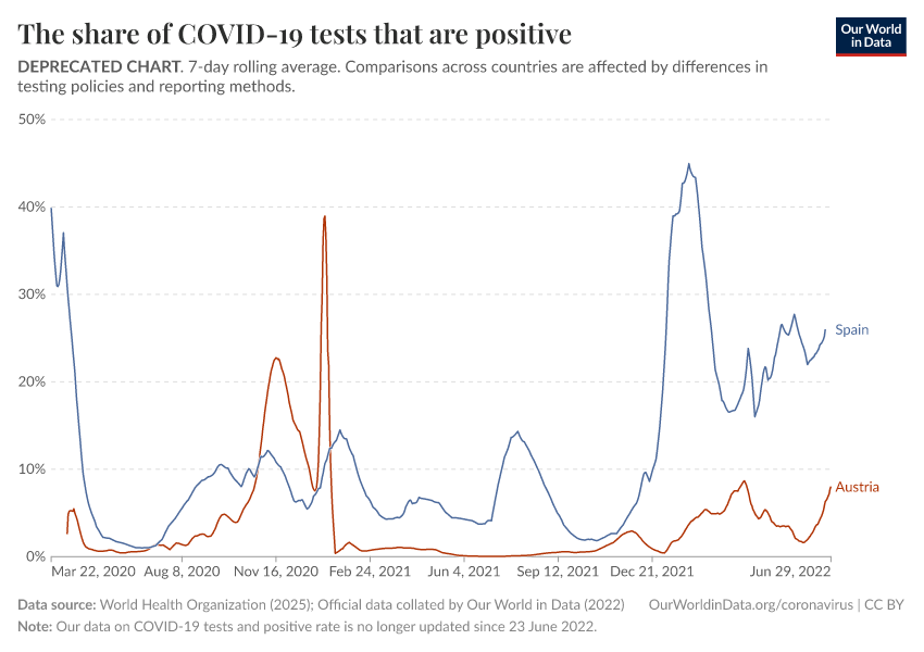 World Health Organization (2025); Official data collated by Our World in Data (2022) – with major processing by Our World in Data. “The share of COVID-19 tests that are positive” [dataset]. World Health Organization, “COVID-19 Dashboard WHO COVID-19 Dashboard - Daily cases and deaths”; Official data collated by Our World in Data, “COVID-19, testing” [original data]. Retrieved December 9, 2025 from https://archive.ourworldindata.org/20251209-063408/grapher/positive-rate-daily-smoothed.html (archived on December 9, 2025).