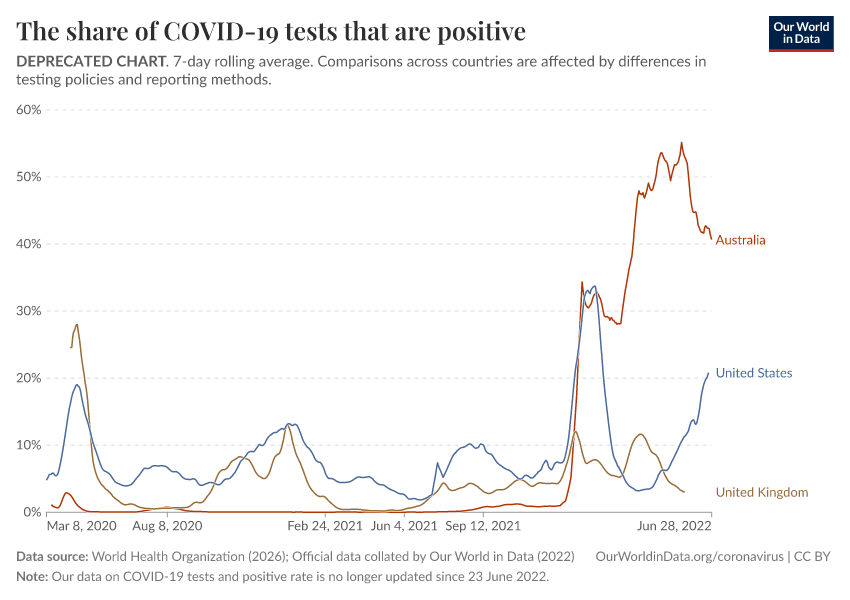“Data Page: The share of COVID-19 tests that are positive”. Our World in Data (2026). Data adapted from World Health Organization, Official data collated by Our World in Data. Retrieved from https://archive.ourworldindata.org/20260423-063326/grapher/positive-rate-daily-smoothed.html [online resource] (archived on April 23, 2026).How to cite this data
