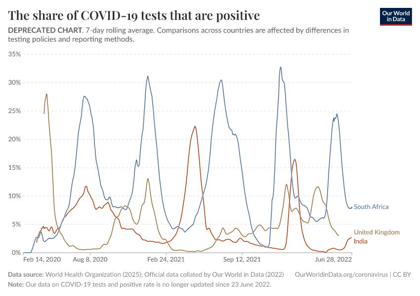 World Health Organization (2025); Official data collated by Our World in Data (2022) – with major processing by Our World in Data. “The share of COVID-19 tests that are positive” [dataset]. World Health Organization, “COVID-19 Dashboard WHO COVID-19 Dashboard - Daily cases and deaths”; Official data collated by Our World in Data, “COVID-19, testing” [original data]. Retrieved December 6, 2025 from https://archive.ourworldindata.org/20251205-063407/grapher/positive-rate-daily-smoothed.html (archived on December 5, 2025).