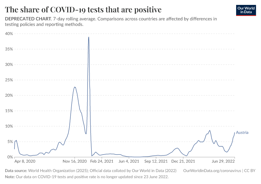 World Health Organization (2025); Official data collated by Our World in Data (2022) – with major processing by Our World in Data. “The share of COVID-19 tests that are positive” [dataset]. World Health Organization, “COVID-19 Dashboard WHO COVID-19 Dashboard - Daily cases and deaths”; Official data collated by Our World in Data, “COVID-19, testing” [original data]. Retrieved December 6, 2025 from https://archive.ourworldindata.org/20251205-063407/grapher/positive-rate-daily-smoothed.html (archived on December 5, 2025).