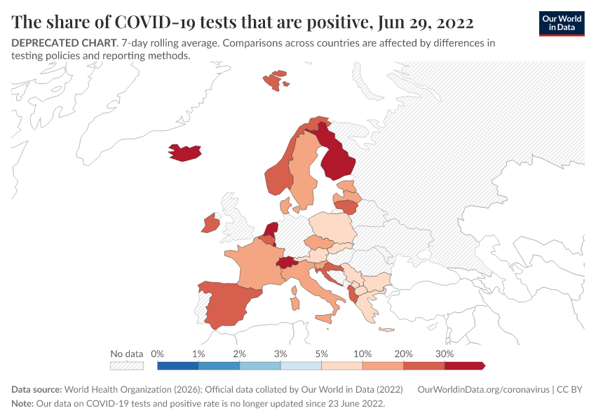 “Data Page: The share of COVID-19 tests that are positive”. Our World in Data (2026). Data adapted from World Health Organization, Official data collated by Our World in Data. Retrieved from https://archive.ourworldindata.org/20260206-063622/grapher/positive-rate-daily-smoothed.html [online resource] (archived on February 6, 2026).How to cite this data