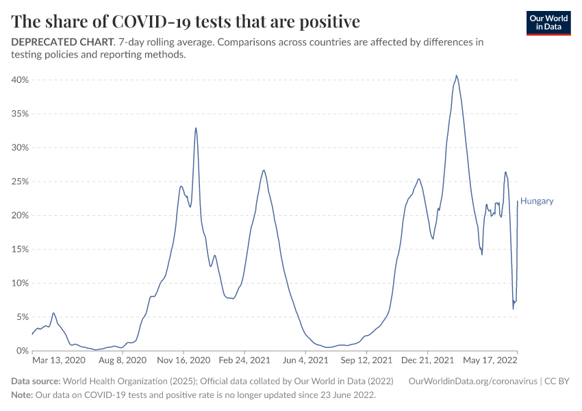 World Health Organization (2025); Official data collated by Our World in Data (2022) – with major processing by Our World in Data. “The share of COVID-19 tests that are positive” [dataset]. World Health Organization, “COVID-19 Dashboard WHO COVID-19 Dashboard - Daily cases and deaths”; Official data collated by Our World in Data, “COVID-19, testing” [original data]. Retrieved December 10, 2025 from https://archive.ourworldindata.org/20251210-063403/grapher/positive-rate-daily-smoothed.html (archived on December 10, 2025).