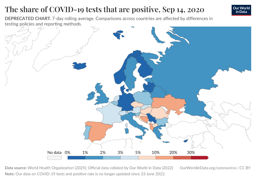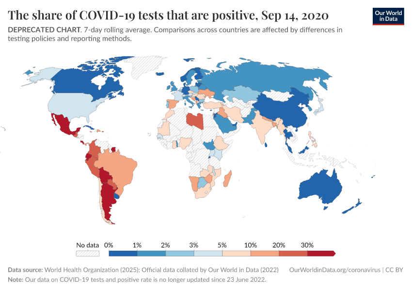 “Data Page: The share of COVID-19 tests that are positive”. Our World in Data (2025). Data adapted from World Health Organization, Official data collated by Our World in Data. Retrieved from https://archive.ourworldindata.org/20251204-063323/grapher/positive-rate-daily-smoothed.html [online resource] (archived on December 4, 2025).How to cite this data