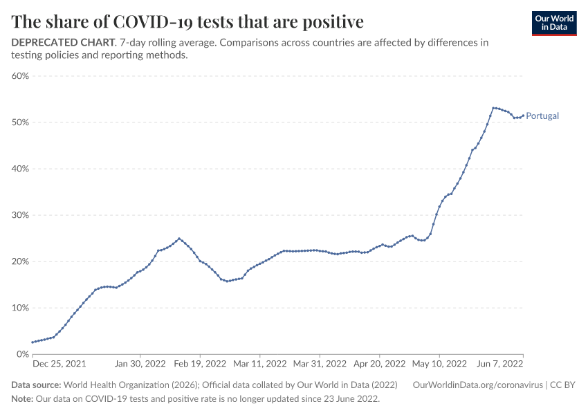 “Data Page: The share of COVID-19 tests that are positive”. Our World in Data (2026). Data adapted from World Health Organization, Official data collated by Our World in Data. Retrieved from https://archive.ourworldindata.org/20260107-063307/grapher/positive-rate-daily-smoothed.html [online resource] (archived on January 7, 2026).