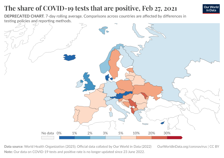 “Data Page: The share of COVID-19 tests that are positive”. Our World in Data (2025). Data adapted from World Health Organization, Official data collated by Our World in Data. Retrieved from https://archive.ourworldindata.org/20251229-063330/grapher/positive-rate-daily-smoothed.html [online resource] (archived on December 29, 2025).How to cite this data