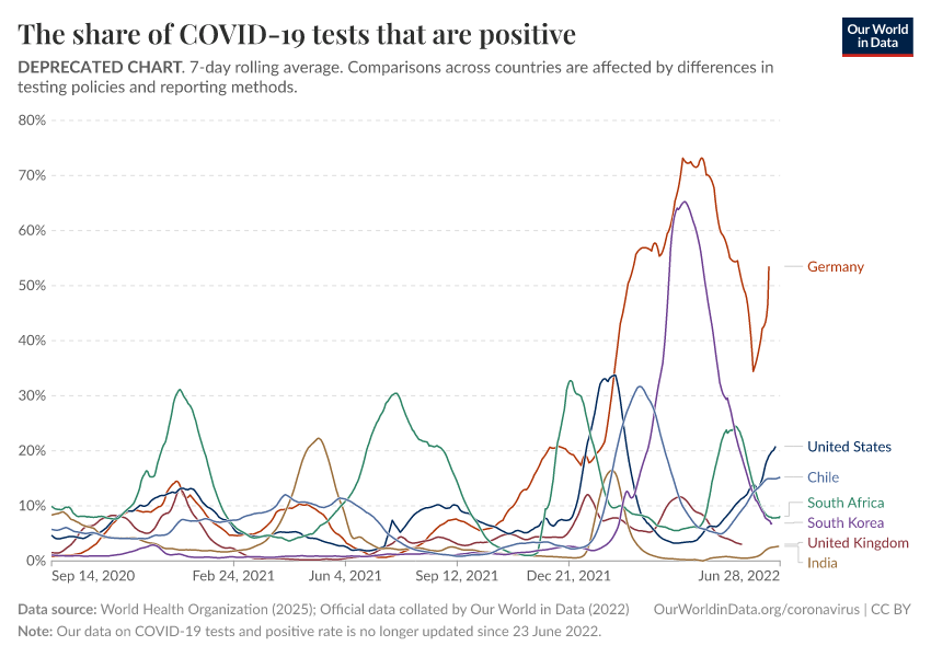 World Health Organization (2025); Official data collated by Our World in Data (2022) – with major processing by Our World in Data. “The share of COVID-19 tests that are positive” [dataset]. World Health Organization, “COVID-19 Dashboard WHO COVID-19 Dashboard - Daily cases and deaths”; Official data collated by Our World in Data, “COVID-19, testing” [original data]. Retrieved December 21, 2025 from https://archive.ourworldindata.org/20251220-063401/grapher/positive-rate-daily-smoothed.html (archived on December 20, 2025).