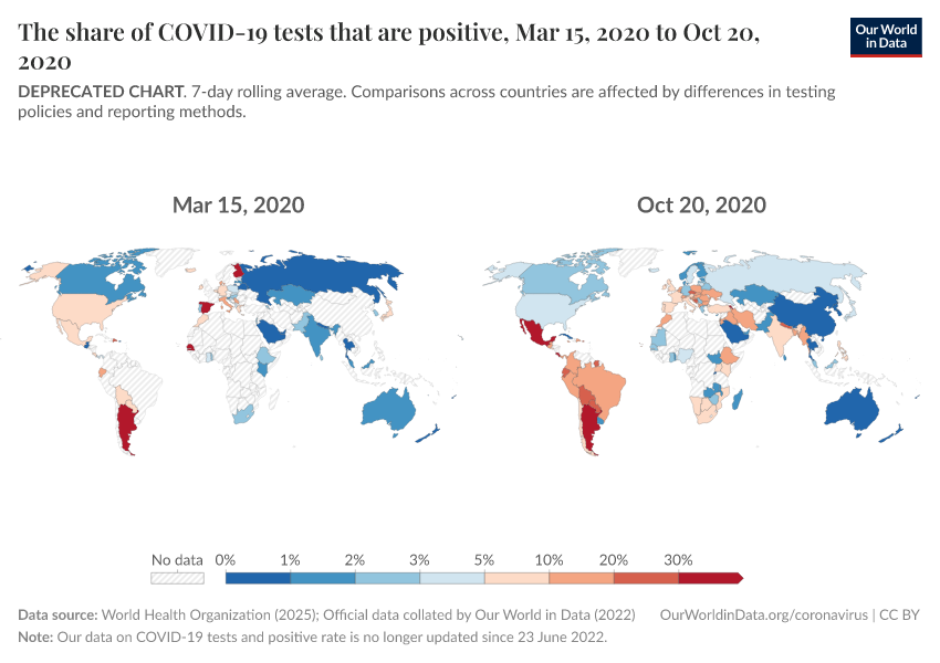 World Health Organization (2025); Official data collated by Our World in Data (2022) – with major processing by Our World in Data. “The share of COVID-19 tests that are positive” [dataset]. World Health Organization, “COVID-19 Dashboard WHO COVID-19 Dashboard - Daily cases and deaths”; Official data collated by Our World in Data, “COVID-19, testing” [original data]. Retrieved December 24, 2025 from https://archive.ourworldindata.org/20251224-063337/grapher/positive-rate-daily-smoothed.html (archived on December 24, 2025).