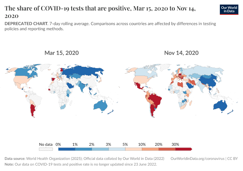 World Health Organization (2025); Official data collated by Our World in Data (2022) – with major processing by Our World in Data. “The share of COVID-19 tests that are positive” [dataset]. World Health Organization, “COVID-19 Dashboard WHO COVID-19 Dashboard - Daily cases and deaths”; Official data collated by Our World in Data, “COVID-19, testing” [original data]. Retrieved December 19, 2025 from https://archive.ourworldindata.org/20251218-063317/grapher/positive-rate-daily-smoothed.html (archived on December 18, 2025).