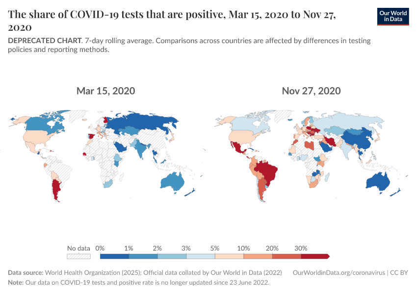 World Health Organization (2025); Official data collated by Our World in Data (2022) – with major processing by Our World in Data. “The share of COVID-19 tests that are positive” [dataset]. World Health Organization, “COVID-19 Dashboard WHO COVID-19 Dashboard - Daily cases and deaths”; Official data collated by Our World in Data, “COVID-19, testing” [original data]. Retrieved December 19, 2025 from https://archive.ourworldindata.org/20251219-063428/grapher/positive-rate-daily-smoothed.html (archived on December 19, 2025).