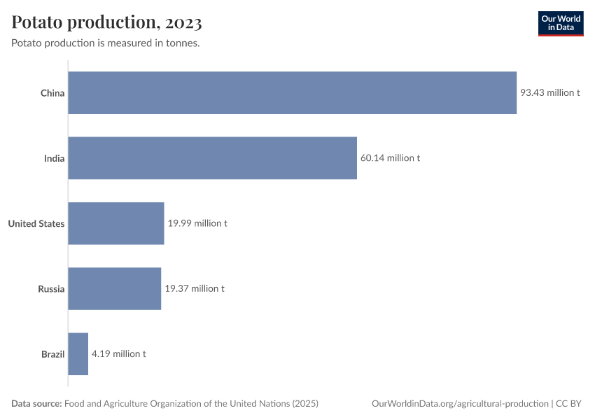 Food and Agriculture Organization of the United Nations (2025) – with major processing by Our World in Data. “Potato production – UN FAO” [dataset]. Food and Agriculture Organization of the United Nations, “Production: Crops and livestock products” [original data]. Retrieved February 24, 2026 from https://archive.ourworldindata.org/20260119-235736/grapher/potato-production.html (archived on January 19, 2026).