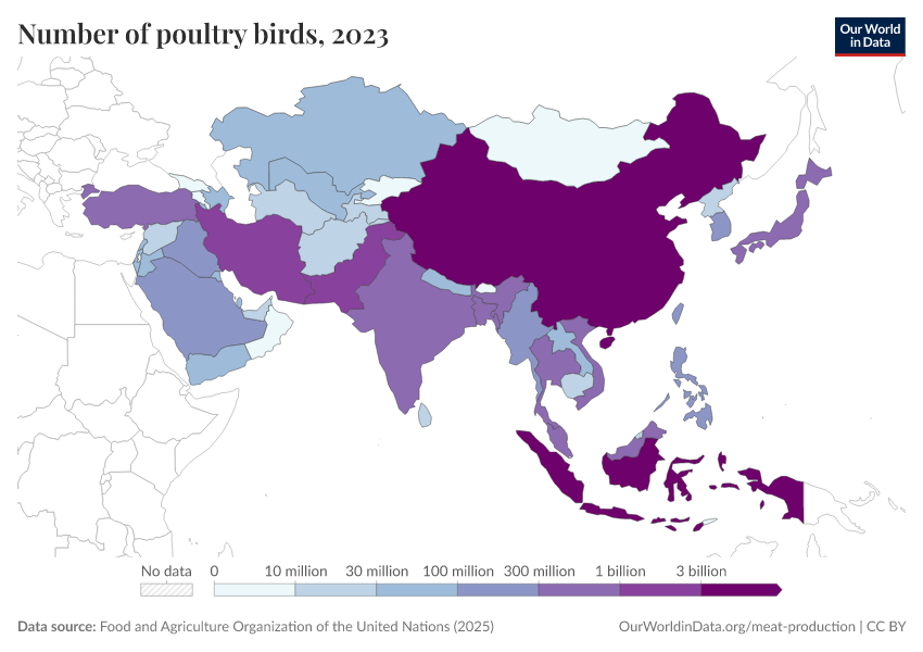 “Data Page: Number of poultry birds”, part of the following publication: Hannah Ritchie, Pablo Rosado, and Max Roser (2023) - “Agricultural Production”. Data adapted from Food and Agriculture Organization of the United Nations. Retrieved from https://archive.ourworldindata.org/20251014-161652/grapher/poultry-livestock-count.html [online resource] (archived on October 14, 2025).How to cite this data