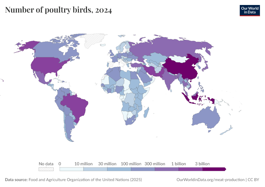 “Data Page: Number of poultry birds”, part of the following publication: Hannah Ritchie, Pablo Rosado, and Max Roser (2023) - “Agricultural Production”. Data adapted from Food and Agriculture Organization of the United Nations. Retrieved from https://archive.ourworldindata.org/20260304-094028/grapher/poultry-livestock-count.html [online resource] (archived on March 4, 2026).